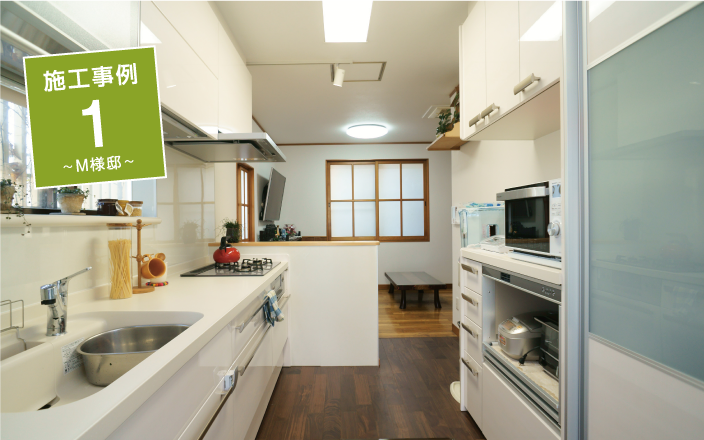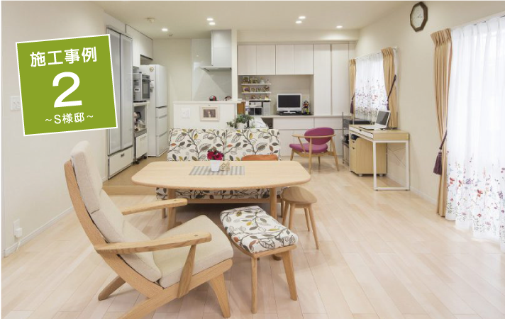 家族の生活の変化に伴い、ご夫婦がコンパクトに快適に暮らせるように考えました。カウンターでご飯を食べたい、キッチンの手元を隠したいということがご希望でしたので、ダイニング側からの視線をさえぎりつつ、家事動線も考え、キッチンとダイニングの間にカウンターを設けました。海外旅行に行かれることの多いご夫婦のこだわりの調度品や、奥さまの趣味の皮細工をリフォームに反映しました。愛着のある我が家でご夫婦の時間をゆっくり過ごせるような空間になりました。